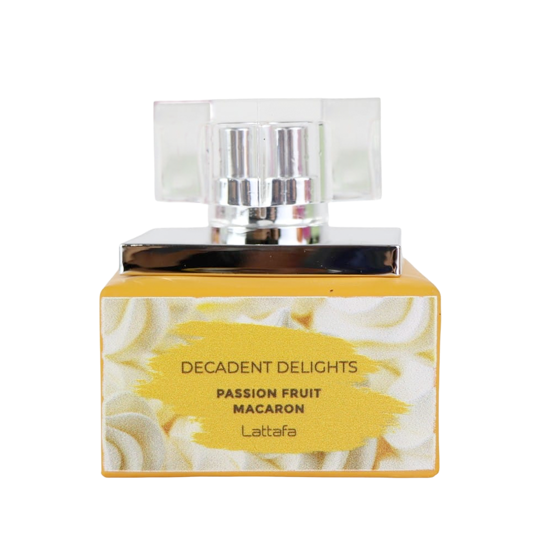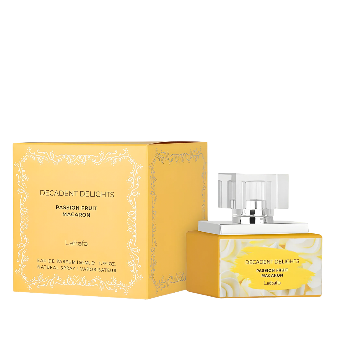 Fragancia gourmand frutal que combina la frescura tropical del maracuyá y durazno con un corazón suave de almendra y flores blancas. Su fondo de vainilla, almizcle y ámbar crea un aroma dulce, cremoso y elegante inspirado en los macarons franceses con un toque exótico.