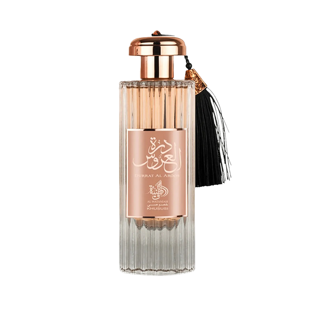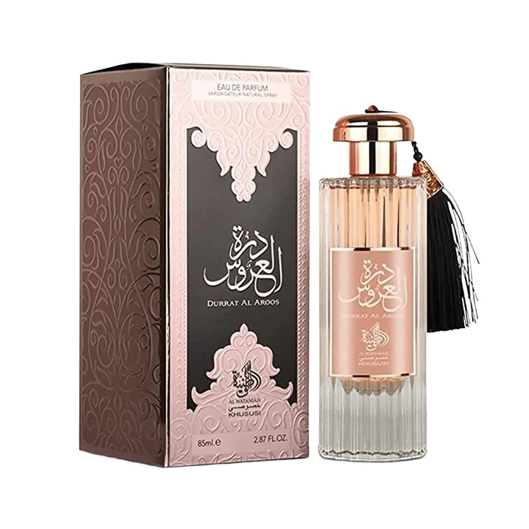 Durrat Al Aroos de Al Wataniah es una fragancia de la familia olfativa Oriental para Mujeres. Durrat Al Aroos se lanzó en 2022. Las Notas de Salida son almizcle blanco y cipriol (nagarmota); las Notas de Corazón son vainilla, cardamomo y azafrán; las Notas de Fondo son madera de gaiac y cumarina.