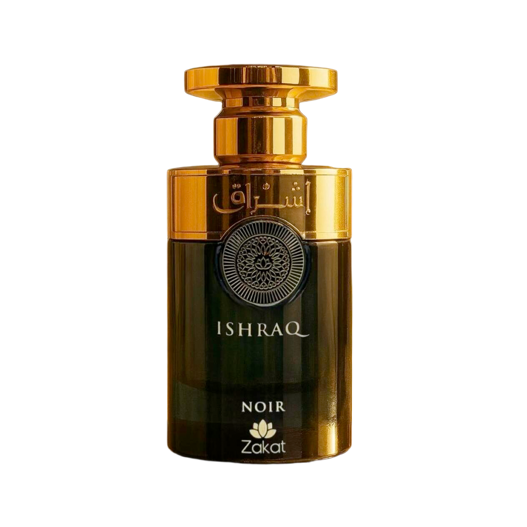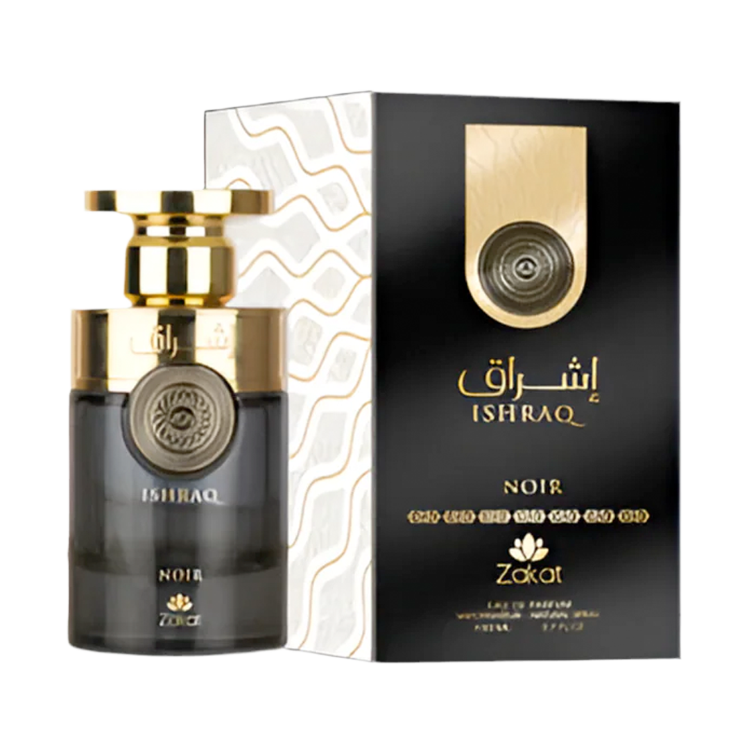 Ishraq Noir de Zakat es una lujosa fragancia árabe unisex/masculina, caracterizada por sus notas amaderadas, resinosas y dulces, con toques de azafrán, jazmín, cedro y ámbar. Disponible comúnmente en formato Eau de Parfum de 100ml (3.4 oz), se destaca por su perfil olfativo elegante y duradero, a menudo descrito como sofisticado y de alta calidad.
