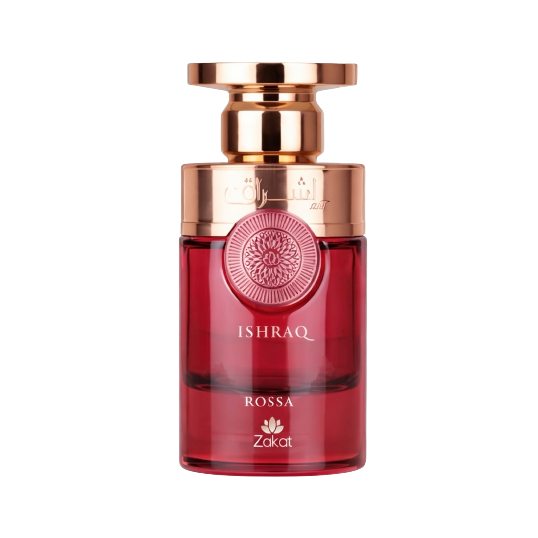 Ishraq Rossa de Zakat es un Eau de Parfum de 100 ml (3.4 fl oz) diseñado para mujeres, caracterizado por una fragancia lujosa y duradera con notas cítricas y dulces. Esta fragancia árabe combina mandarina, bergamota y pomelo en la salida, azahar, frambuesa y grosella negra en el corazón, y una base dulce de almizcle, algodón de azúcar y crema batida.