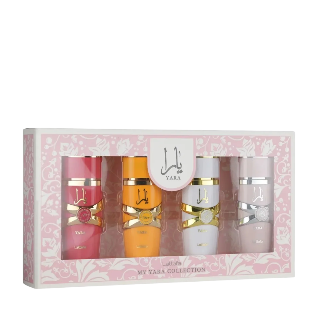 Este es un estuche de miniaturas de perfumes femeninos de Lattafa que incluye cuatro fragancias distintas de 25 ml cada una inspiradas en la línea Yara. Está pensado para que puedas probar diferentes aromas según tu estado de ánimo o ocasión, o para llevar contigo de viaje o en el bolso.