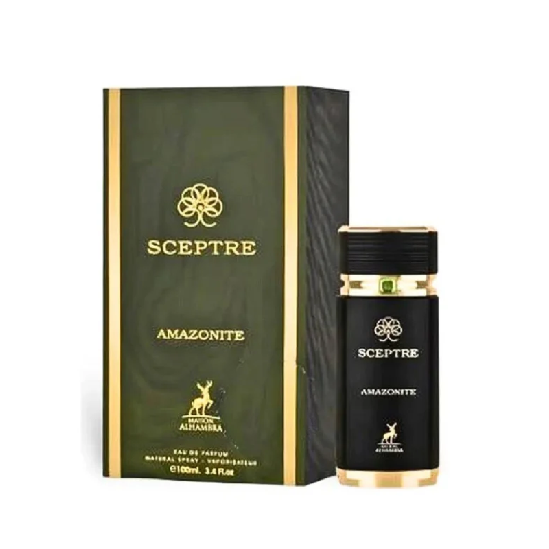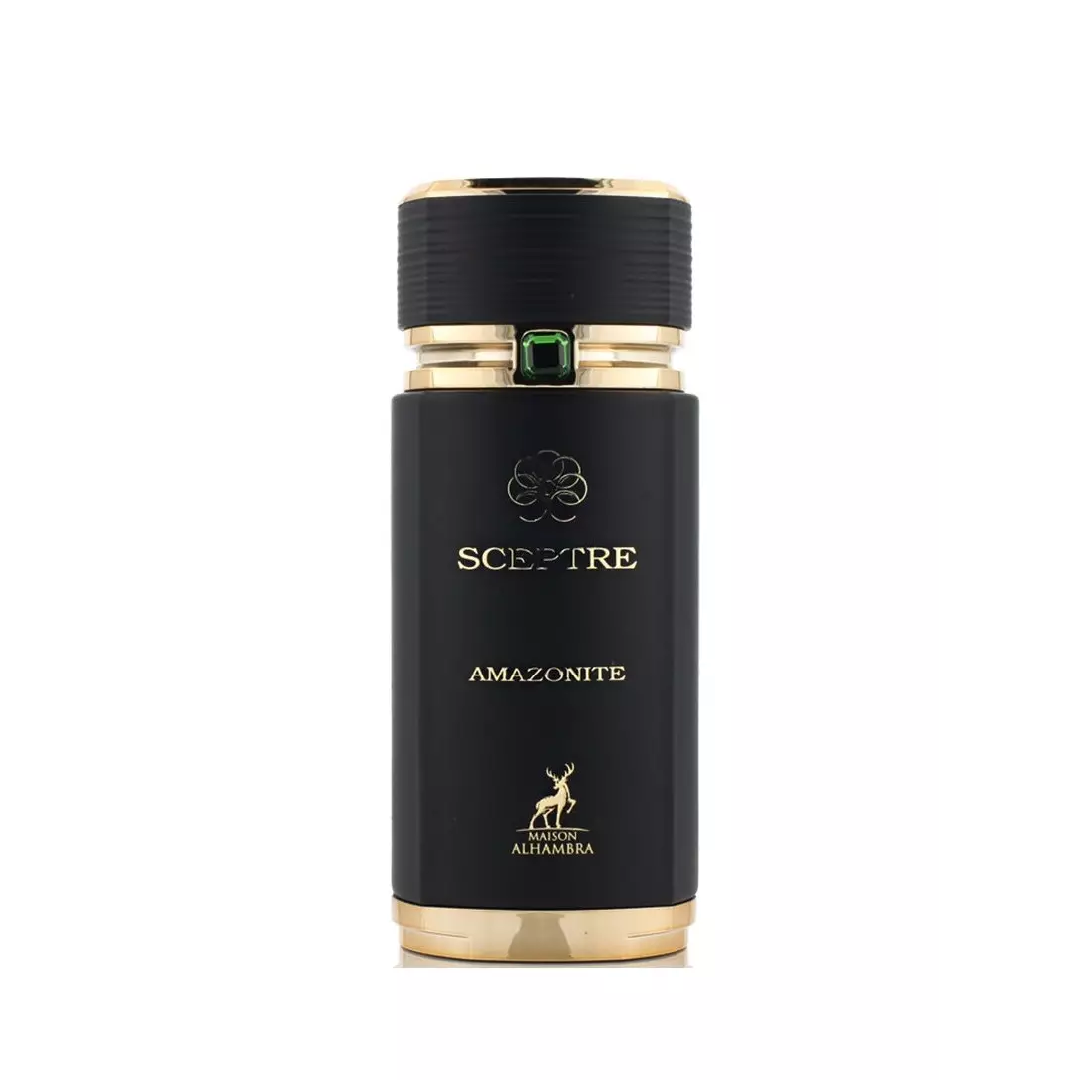 Sceptre Amazonite de Maison Alhambra es una fragancia de la familia olfativa Amaderada Especiada para Hombres y Mujeres. Las Notas de Salida son nuez moscada y canela; las Notas de Corazón son cipriol (nagarmota) y incienso de olíbano (franquincienso); las Notas de Fondo son madera de oud, azafrán y almizcle negro.