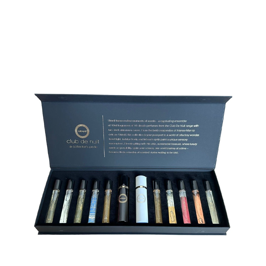 El set Armaf Club De Nuit Discovery Set 10 x 10 ml + 2 atomizadores (spr case) es una colección de miniaturas de fragancias de la prestigiosa línea Club De Nuit de Armaf, ideal para quienes desean explorar una amplia variedad de aromas sin comprar frascos grandes o para llevar sus fragancias favoritas a todas partes durante viajes o salidas.
