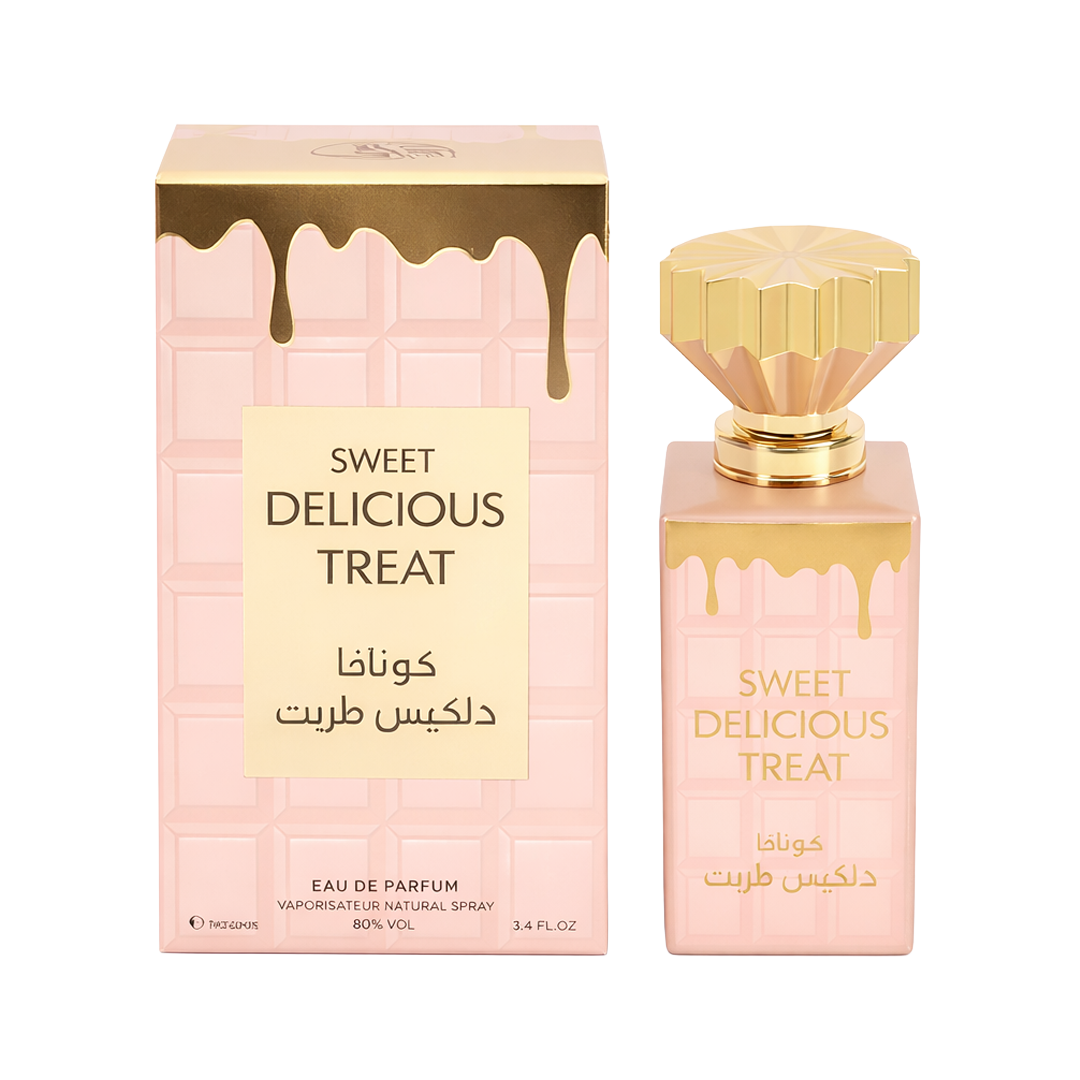 Sweet Delicious Treat de Afaq es una fragancia dulce, femenina y alegre que combina aromas frutales jugosos con un corazón gourmand de caramelo de fresa y florales suaves, asentándose sobre una base cálida y cremosa de vainilla, almizcle, ámbar y sándalo. Evoca sensaciones de dulzura tentadora, ideal para uso diario y ocasiones informales con un carácter encantador y coqueto.